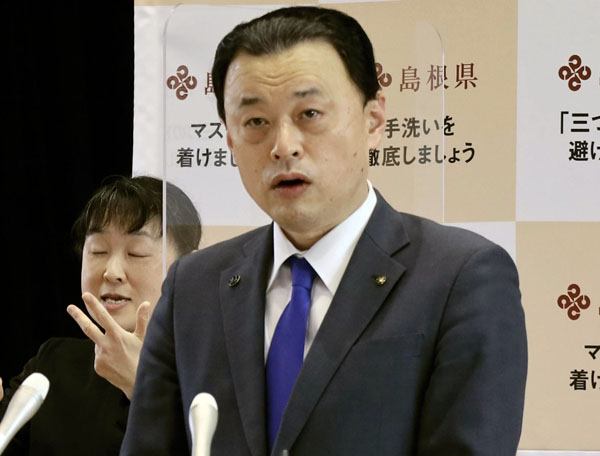 19日、会見する丸山達也島根県知事(C)共同通信社