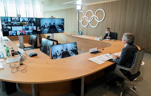 東京五輪組織委とリモート会議をするIOCのバッハ会長(右)ら、理事会(C)ロイター