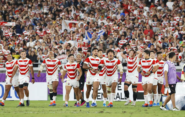 ラグビーW杯1次リーグで初の8強進出を決め、喜ぶ日本代表(C)共同通信社