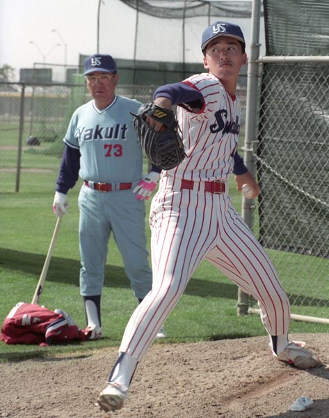 高卒2年目のユマキャンプで投球練習をする石井(後方は野村監督)/(C)共同通信社