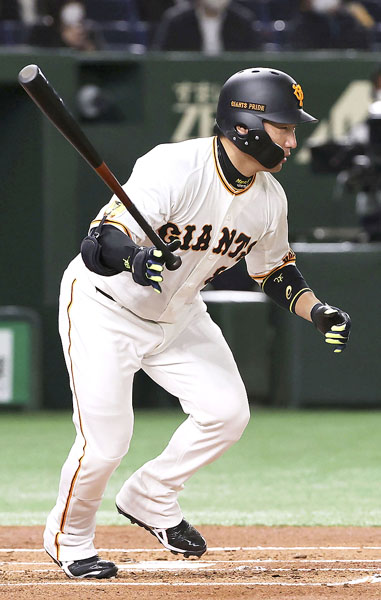 3日のオープン戦初回に右前打を放つ丸(C)共同通信社