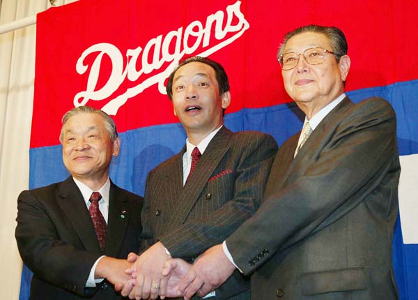 2003年10月に就任した中日の落合博満監督(中央)。左は白井オーナー、右は西川球団社長(C)日刊ゲンダイ