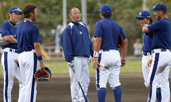 ノック終了後、荒木(左)、森野(左4)、井端(右奥)らと話し合う落合監督(左3)/(C)日刊ゲンダイ
