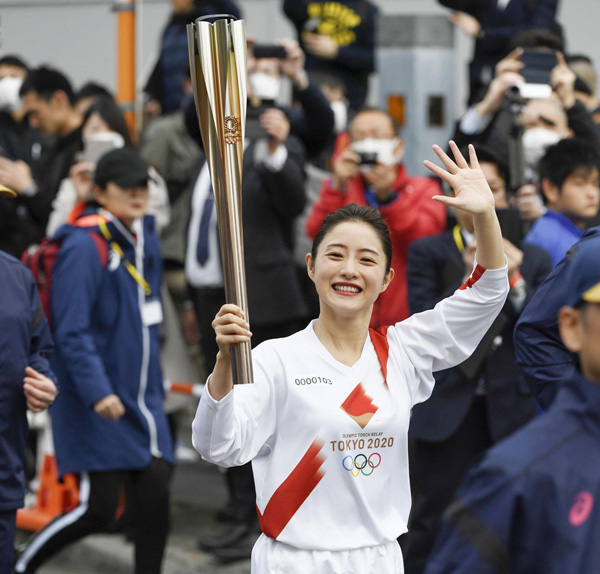昨2020年2月のリハーサルでトーチを掲げた石原さとみは果たして…(C)共同通信社