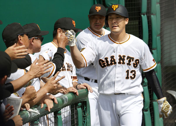 坂本の先制打で生還し、原監督(左2)らに迎えられる梶谷(C)共同通信社