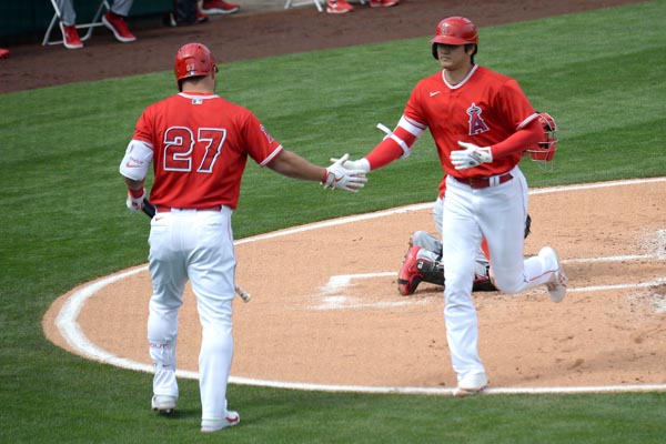一回、2号ソロを放ってトラウト(左)とタッチを交わす大谷(C)ロイター/USA TODAY Sports