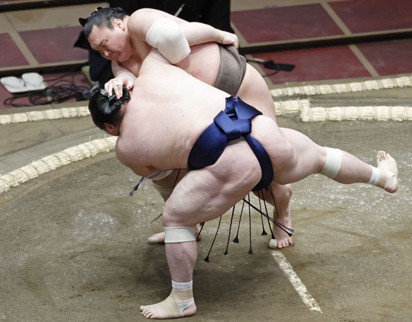 小手投げで宝富士を下す白鵬(C)共同通信社