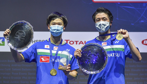 全英オープン男子ダブルスで優勝した遠藤(右)、渡辺組(C)AP=共同