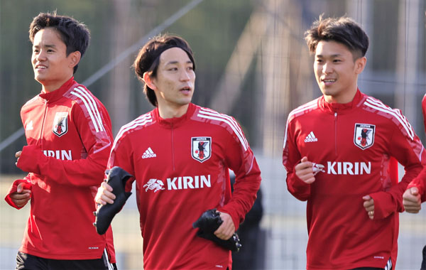 U-24代表の千葉合宿で並んでランニングする(左から)久保、三好、食野(C)Norio ROKUKAWA/office La Strada