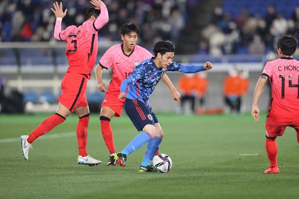 日韓戦で積極的にシュートを放つ江坂(C)Norio ROKUKAWA/office La Strada
