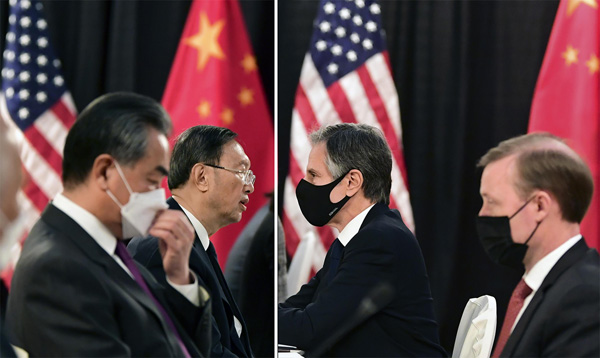 米アンカレジで会談した米国のブリンケン国務長官(右2)とサリバン大統領補佐官、中国の楊潔篪・共産党政治局員(左2)と王毅国務委員兼外相(C)AP=共同