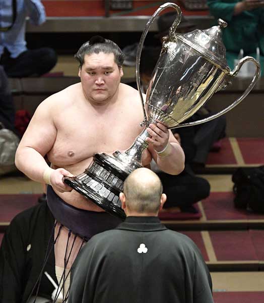 優勝インタビューでも…(春場所で優勝し、賜杯を受け取る照ノ富士)/(C)共同通信社