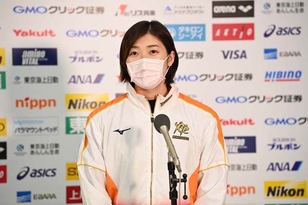 競泳日本選手権を前に取材に応じる池江璃花子(日本水泳連盟提供)