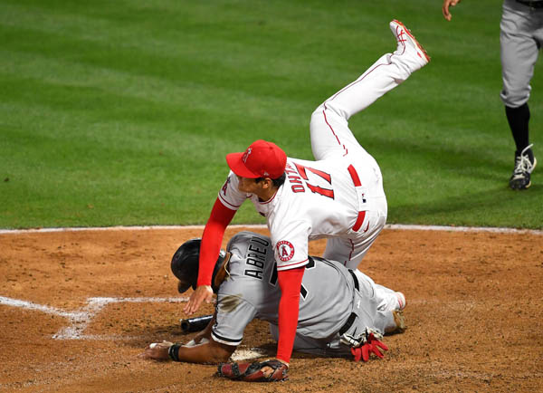 五回、本塁ベースカバーに入ってスライディングされる大谷(C)ロイター/USA TODAY Sports