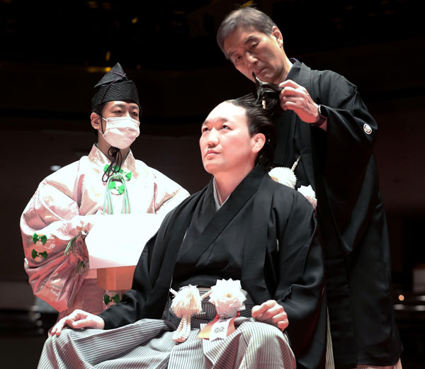 断髪式で荒鷲の大銀杏にハサミを入れる峰崎親方(代表撮影)