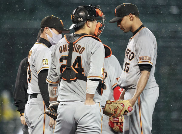 三回途中、6失点でKOされたサンチェス(右)/(C)共同通信社