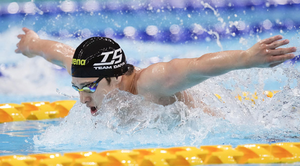 男子200mバタフライ決勝、2位で代表入りを決めた瀬戸(C)共同通信社