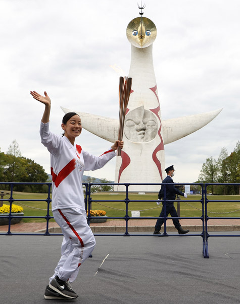 聖火リレーで太陽の塔の前を走る、元トランポリン選手の廣岡遥(C)日刊ゲンダイ