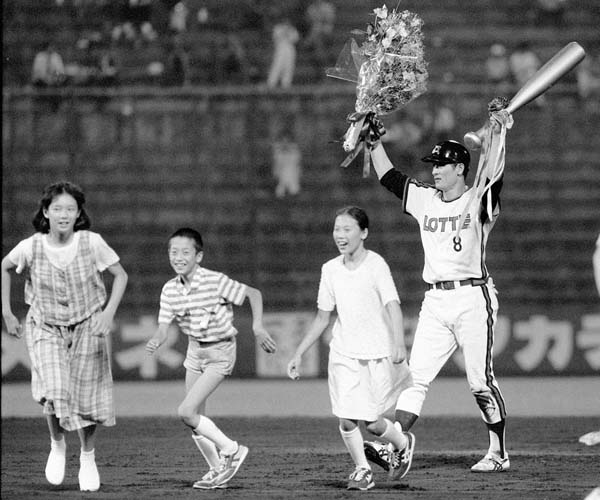 1985年に2000安打を達成、子供たちから祝福される有藤さん(C)共同通信社