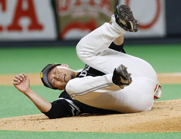 捕球する際に負傷、左足首を抑えて倒れ込んだ千賀(C)共同通信社