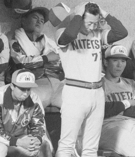 意気消沈する近鉄仰木監督ら近鉄ベンチ(C)共同通信社