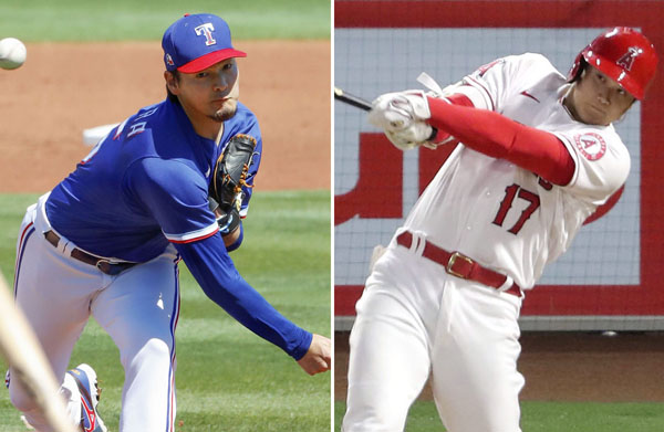 レンジャーズの有原(左)とエンゼルスの大谷(C)共同通信社