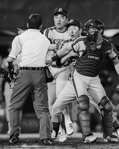 審判に抗議する金田さんを止める徳武さん(C)共同通信社