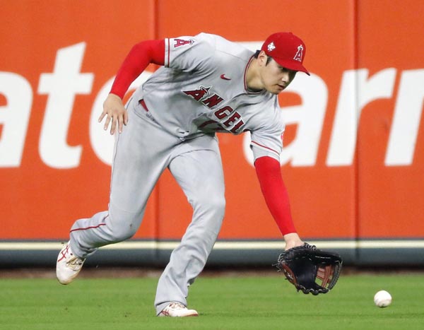 アストロズ戦の八回、持参している外野用グラブでゴロを処理した大谷(C)共同通信社