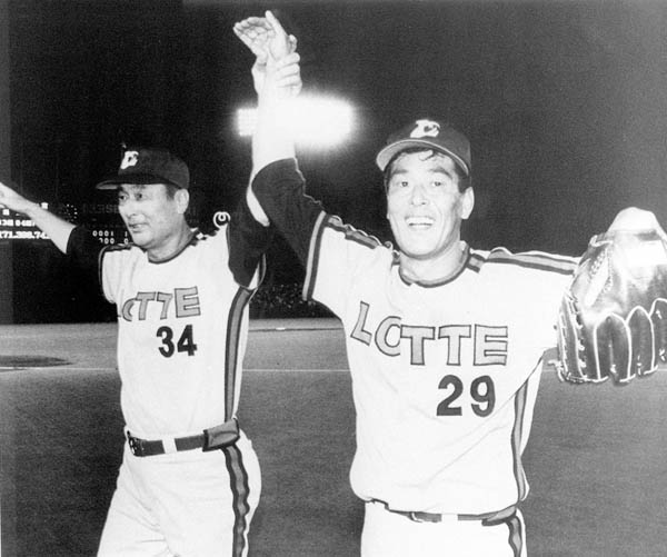 マサカリ投法で通算215勝をマーク(金田監督とファンの声援に応える村田兆治投手=右)/(C)共同通信社