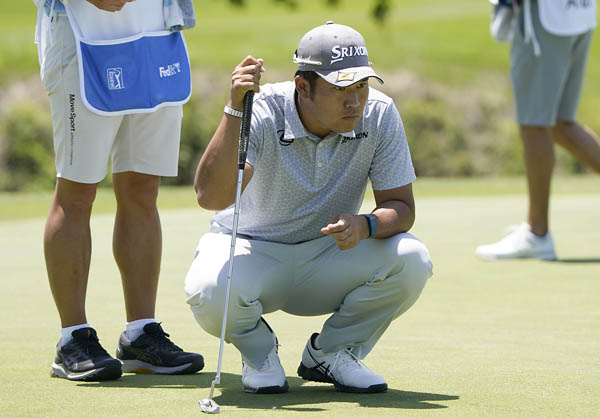 4番グリーン上で芝を読む松山(C)ロイター/USA TODAY Sports
