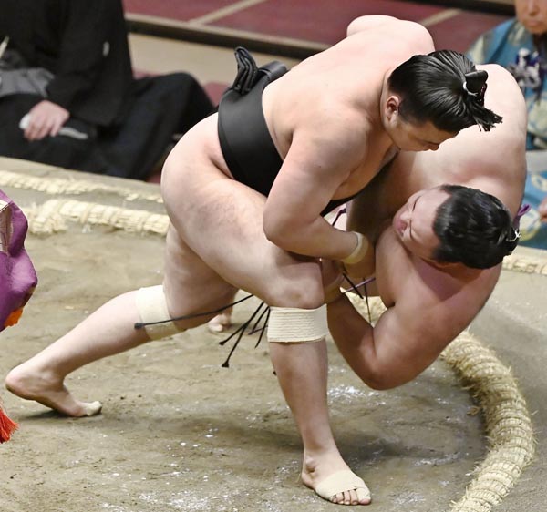 霧馬山(左)に上手投げで敗れた朝乃山(C)共同通信社