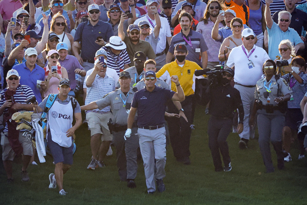 多くのギャラリーに囲まれて18番グリーンに向かうミケルソン(C)ロイター/USA TODAY Sports