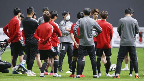 ジャマイカ代表との国際親善試合が中止となり、U-24日本代表との代替試合に向けた練習で、円陣を組む森保監督(央)ら(C)共同通信社