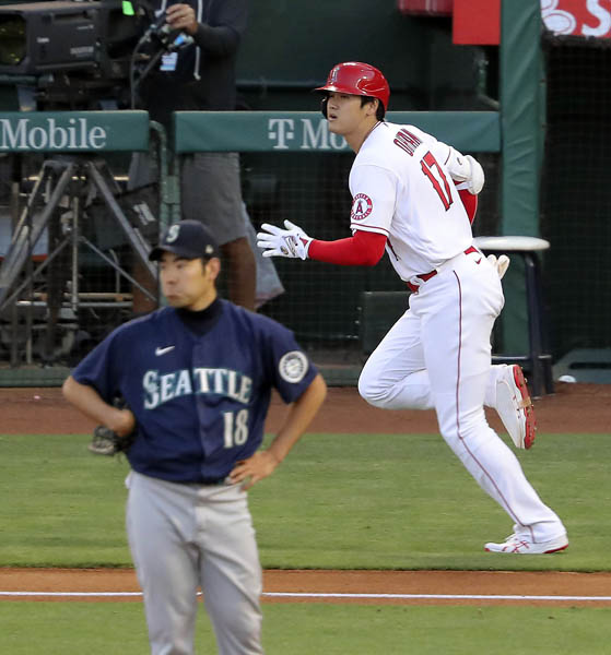 マリナーズ戦の一回、菊池(左)との対決で先制の16号本塁打を放った大谷(C)共同通信社
