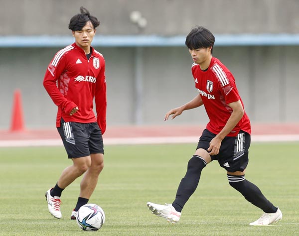 11日のジャマイカ戦に向けて旗手(左)が川崎のチームメートMF三苫と一緒に調整に励む(C)共同通信社
