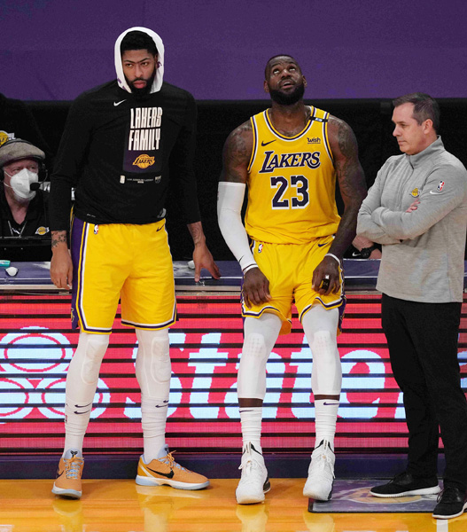 レブロン・ジェームズ(中)とアンソニー・デービス(左)/(C)ロイター/USA TODAY Sports