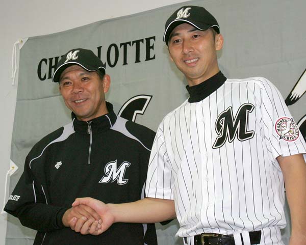 ロッテ入団会見での今岡(右)と筆者(C)共同通信社