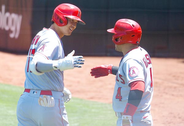 二回、本塁打を放ってイグレシアスとタッチを交わす大谷(C)ロイター/USA TODAY Sports