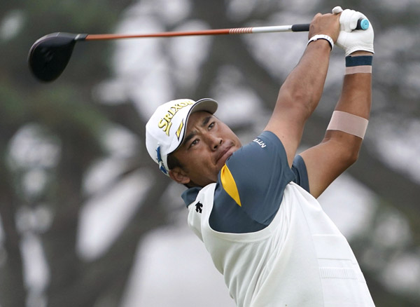 最終ラウンド、5番でティーショットを放つ松山(C)共同通信社