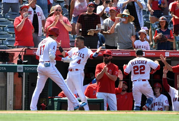 チームメイトのイグレシアス(背番号4)らに祝福される大谷(C)ロイター/USA TODAY Sports