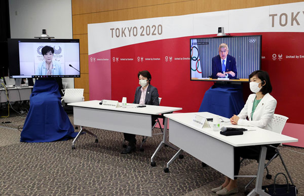 昨21日、5者協議に出席した(左から)小池都知事、橋本組織委会長、IOCバッハ会長、丸川五輪相(代表撮影)