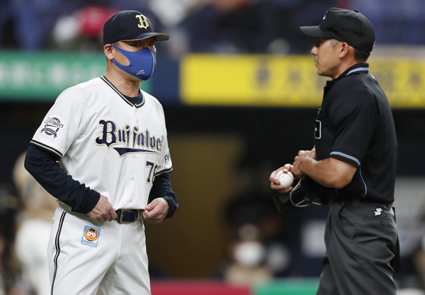初回に先発山岡の交代を告げる中嶋監督(C)共同通信社