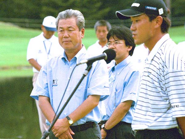 2002年、日本ゴルフツアー選手権表彰式の島田幸作氏(左)と優勝した佐藤信人プロ(C)日刊ゲンダイ