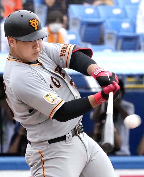 六回に勝ち越し3ランを放つ巨人・岡本和(C)共同通信社