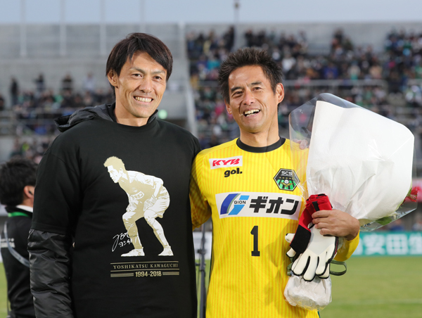 J相模原を最後に現役を引退したGK川口(2018年12月2日・鹿児島戦)。左は代表レギュラーの座をかけて鎬を削ったGK楢崎正剛。引退セレモニーに出席した(C)Norio ROKUKAWA/office La Strada