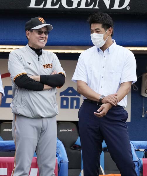 6月、意見交換する巨人・原監督(左)と稲葉日本代表監督(C)共同通信社