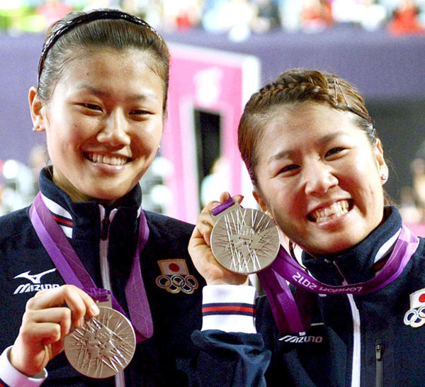 日本バドミントン史上初の銀メダルを獲得した筆者(右)と垣岩(C)共同通信社