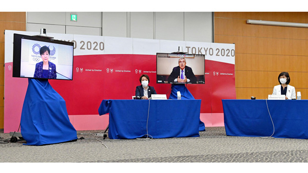 5者協議に臨む(左から)小池百合子都知事、橋本聖子組織委会長、バッハIOC会長、丸川五輪相(代表撮影)