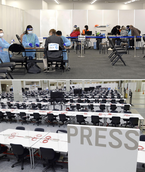 アプリ追跡には苦情が多く海外では「報道の自由の侵害」と解釈(上から成田空港スマホレンタル&説明ブース、海外メディアが大挙するメインプレスセンター)/(C)共同通信社