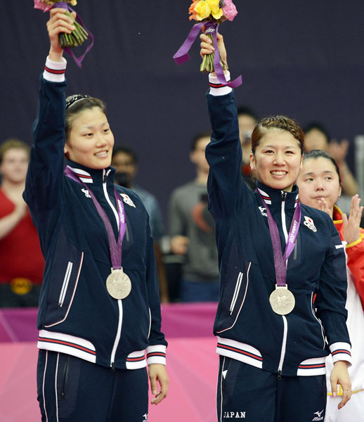 表彰式の後はめまぐるしかった(銀メダルを獲得し、声援に応える藤井と垣岩=左)/(C)共同通信社